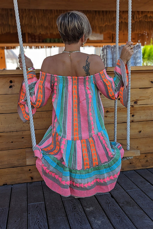 Friendly Shores Linen Blend Ethnic Print Off Shoulder Loose Mini Dress